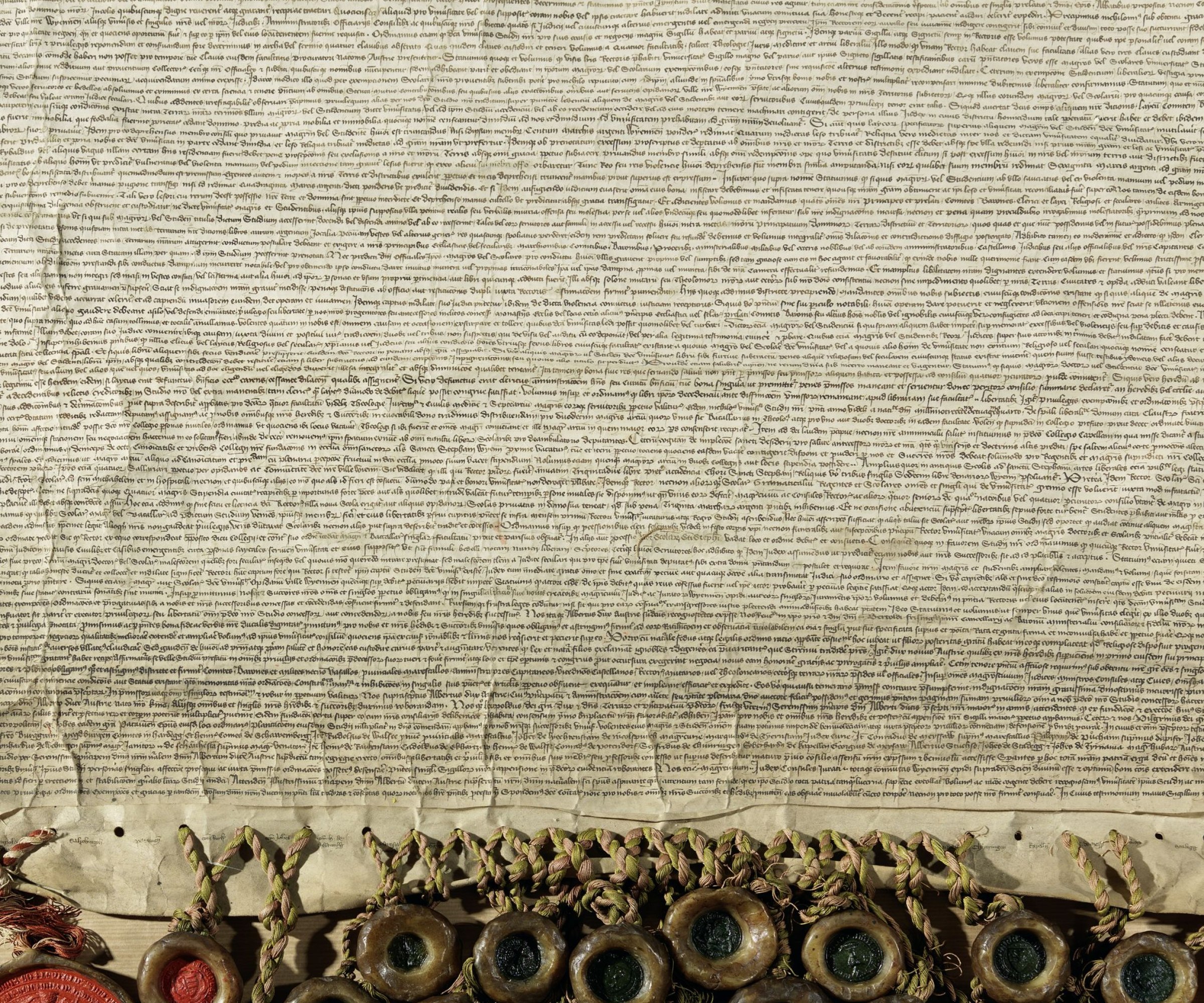 Mit dem monumentalem Privileg Albrechts III. wurde 1384 ein entscheidender Wendepunkt gesetzt. Die Urkunde war nicht das Werk der herzoglichen Kanzlei, sondern eine Empfängerausfertigung, deren Formulierung auf den „Universitätssachverständigen“ Heinrich von Langenstein zurückgeht, der aus seiner Zeit an der Universität Paris über reiche Erfahrungen verfügte. Schreiber der Urkunde war mit großer Wahrscheinlichkeit Magister Paul Fabri von Geldern, der ebenfalls von der Pariser hohen Schule stammte. Es war also die Universität selbst, die in diesem Fall an ihrer Bestätigung, Neuorganisation und Erweiterung entscheidend mitwirkte. Besonders auffallend und in der Beurkundungspraxis Albrechts III. beispiellos ist die große Zahl von Siegeln: Neben den beiden Herzögen Albrecht und Leopold sowie der Stadt Wien finden sich maßgebliche Herrschafts- und Entscheidungsträger unter den Sieglern dieser Urkunde. Sie alle sollten für die gedeihliche Entwicklung der Universität in die Pflicht genommen werden.
