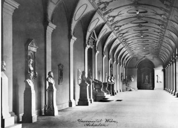 Zum Gestaltungskonzept Ferstels zählte nicht nur die Ausstattung der Arkadengänge mit Denkmälern berühmter Gelehrter, sondern auch die Errichtung eines monumentalen Reiterstandbildes für den Universitätsgründer Rudolf IV. im Zentrum des Hofes. Dazu kam es jedoch nicht, stattdessen wurde 1910 die Brunnenfigur der Kastalia aufgestellt. Die Ausstattung mit Denkmälern wurde hingegen schon bald nach Inbetriebnahme des Hauptgebäudes 1884 vom Akademischen Senat zum Beschluss erhoben. Das erste Denkmal, jenes für den Strafrechtsprofessor Julius Glaser, wurde bereits 1888 enthüllt. Dem folgte die Übertragung älterer Porträtskulpturen aus der Alten Universität sowie dem Allgemeinen Krankenhaus und eine regelrechte „Denkmalflut“ bis zum Ersten Weltkrieg. Bis 2002 wurden in den Arkadengängen über 150 Denkmäler errichtet.