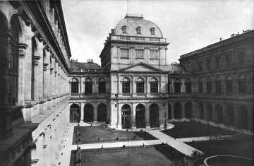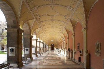Der Arkadenhof besitzt mit einer Längsausdehnung von 70 Metern und einer Breite von 45 Metern Dimensionen, die seinem intendierten monumentalen Charakter entsprechen. Über den in toskanischer Ordnung gegliederten Arkaden befinden sich im ersten Stock Rundbogenfenster mit ionischen Halbsäulen und im zweiten Stock rechteckige Fenster, die von korinthischen Halbsäulen gegliedert werden. Nach eigener Aussage orientierte sich der Architekt dabei am Vorbild des Palazzo Farnese des Antonio da Sangallo d.J. in Rom; eine detaillierte kunstgeschichtliche Analyse erkannte jedoch auch im vom berühmten Renaissance-Architekten Andrea Palladio begonnenen Konvent der Bruderschaft Santa Maria della Carità in Venedig eine stilprägende Zitatvorlage.