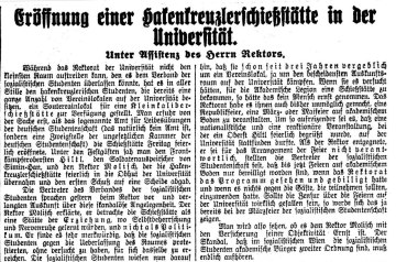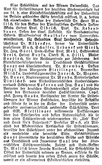„Der Betrieb der Universitäts-Schießstätte wurde Anfang Jänner in vollem Umfang wieder aufgenommen. Für Anfänger und geschlossene Gruppen von akademischen Korporationen, Vereinen und Wehrverbänden finden Ausbildungslehrgänge statt, die den Teilnehmern neben dem praktischen Unterricht im Kleinkaliber-Gewehr und Pistolenschießen auch vollständige theoretische Ausbildung in allen Waffen vermitteln. Ferner ist die Möglichkeit geboten, das freie Sportschießen zu Übungszwecken zu pflegen.“