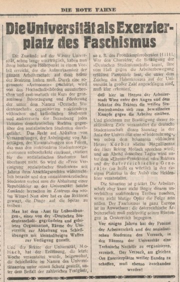 „Es war symptomatisch, daß schon vorher am 14. Jänner das sogenannte Amt für Leibesübungen der Deutschen Studentenschaft an der Universität eine Schießstätte eröffnete. Dabei hielt der bekannte Wiener Frontkämpfer Oberst i.R. Hiltl eine Ansprache. Rektor Molisch nahm die Schießstätte in die Obhut der Universität. An dieser Schießstätte wurden Heimwehrstudenten ausgebildet, später ein eigener Sturm der SA.“