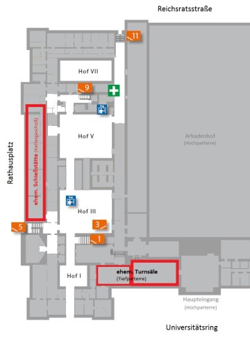 Im Tiefparterre im linken Flügel des neu errichteten Universitätshauptgebäudes war seit 1885 die Turnanstalt untergebracht. Zwei Turnhallen befanden sich zwei Stockwerke unterhalb des kleinen Festsaales, daneben Räumlichkeiten für Garderoben, die sich an Hof 1 und 3 anschlossen, sowie Direktorenzimmer, Gerätedepot und Toilettenanlagen.
