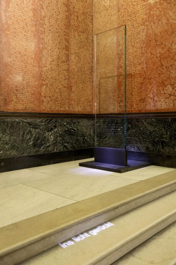 Als weitere Ebene der Distanzierung sowie Vergegenwärtigung ließen die KünstlerInnen vor jenem Bereich der Marmortafel, der die Rektoren der Jahre 1877 bis 1961 auflistet, eine hohe Glasstele errichten, die zwischen die BetrachterInnen und die Rektorenliste tritt, diese aber nicht verdeckt. In diese Stele ist mit Lasertechnik ein liegender Text der Universität eingelassen, der durch gezielte Beleuchtung sichtbar gemacht und als Schatten auch auf den Boden sowie durch Spiegelung in den weiteren Raum der Aula projiziert wird und damit die BetrachterInnen zum Betreten der Nische einlädt: