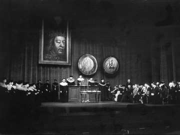 Im Rahmen der Jubiläumswoche (10. bis 15. Mai 1965) fand im Wiener Burgtheater auch die feierliche Ernennung von 29 Ehrendoktor*innen, 15 Ehrenbürger*innen und 10 Ehrensenatoren statt. Eine der geplanten Ehrenpromotionen hatte im Vorfeld der Feiern für großes Aufsehen gesorgt, als publik geworden war, dass ein 1933 veröffentlichtes Werk des zu ehrenden Juristen Ernst Forsthoff klar antisemitische Äußerungen enthielt. Eine parlamentarische Anfrage sozialdemokratischer Abgeordneter sowie eine entsprechende Berichterstattung der Arbeiter-Zeitung hatten Rektor Karl Fellinger unter Druck gesetzt, sodass die Universität die Ehrung Forsthoffs verschob. Die Verleihung fand schließlich unter Anwesenheit zahlreicher internationaler Ehrengäste ohne Forsthoff statt. In seiner Begrüßungsrede hieß Rektor Fellinger „ganz besonders auch die ‚Emigranten‘, jene ehemaligen Mitglieder unserer Universität, die oft von weither gekommen sind, um dieses Fest mit uns zu feiern“, willkommen und äußerte gegenüber den 1938 Vertriebenen die Absicht, man wolle, „wenigstens symbolhaft, ein wenig gutzumachen versuchen, was damals geschah“.