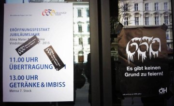 Proteste gegen die Selbstrepräsentation der Universität Wien kamen vor allem vonseiten der ÖH, die schwarze Plakate mit der Aufschrift „650 – Es gibt keinen Grund zu feiern!“ in Universitätsgebäuden anbrachte und u.a. den Werbeslogan „Open since 1365“ mit Verweis auf verschiedenste Zugangsbeschränkungen bzw. die Universität Wien als Eliteninstitution kritisierte, sowie vonseiten der IG LektorInnen, die darauf hinwies, dass die Mehrzahl der LektorInnen unter prekären Arbeitsverhältnissen arbeiten müssen.