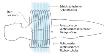 Das mit geringerem technischen Aufwand verbundene und daher auch deutlich kostengünstigere Verfahren ist die sog. Computertomographie (CT), die gegenüber der inzwischen überholten Röntgentomographie eine deutliche Verbesserung darstellt. Im Gegensatz zur Röntgentomographie ist in der Computertomographie die Nutzung eines Computers zwingend nötig, um aus den Rohdaten Schnittbilder erzeugen zu können – daher der Name. Zu beachten ist, dass jede CT-Aufnahme mit einer unvermeidlichen Strahlenbelastung einhergeht.