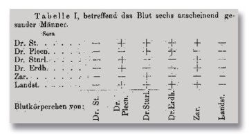 „In einer Anzahl von Fällen (Gruppe A) reagiert das Serum auf die Körperchen einer anderen Gruppe (B), nicht aber auf die der Gruppe A, während wieder die Körperchen A vom Serum B in gleicher Weise beeinflusst werden. In der dritten Gruppe (C) agglutinirt das Serum die Körperchen von A und B, während die Körperchen C durch die Sera von A und B nicht beeinflusst werden“, so Landsteiner in seiner Arbeit.