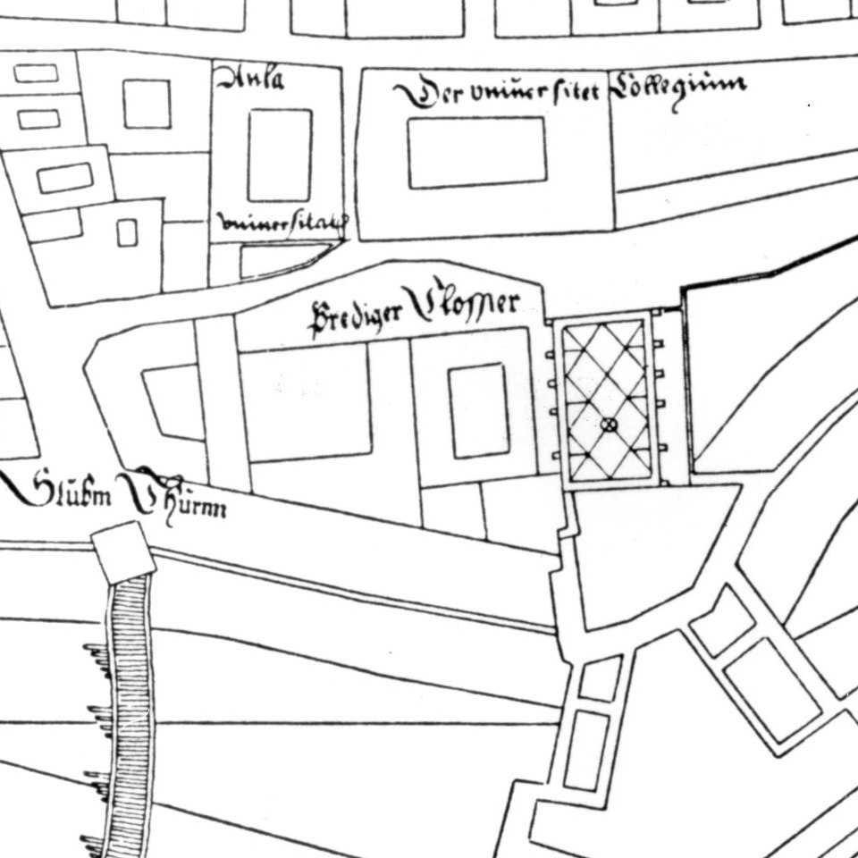 Alte Universität (Herzogskolleg und später entstandene Universitätsbauten) im Stadtplan von Bonifaz Wolmuet (Detailansicht), 1547