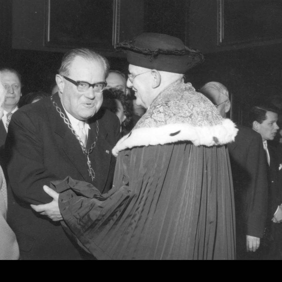 Altrektor Erich Schenk (1902-1974) mit dem Rektorserinnerungszeichen bei der feierlichen Inauguration des Rektors Othmar Kühn