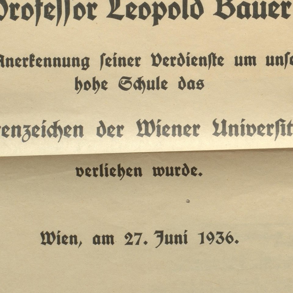 Andruck Ehrenzeichenurkunde für Oberbaurat Prof. Leopold Bauer 1936 Quelle Archiv der Universität Wien S 91.8 Bildgattung Dokument