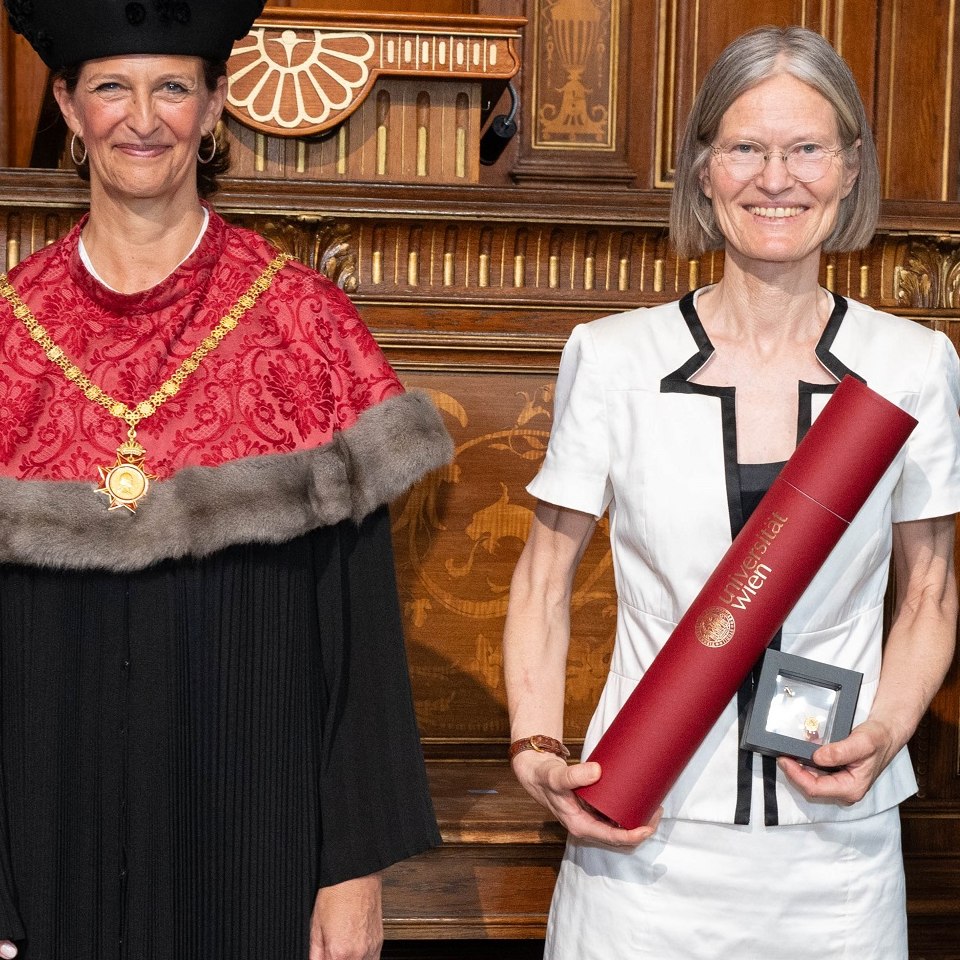 Anne Peters bei der Verleihung des Ehrendoktorats der Universität Wien durch Dekanin Brigitta Zöchling-Jud (2.v.l.) und Rektor Sebastian Schütze (r.)