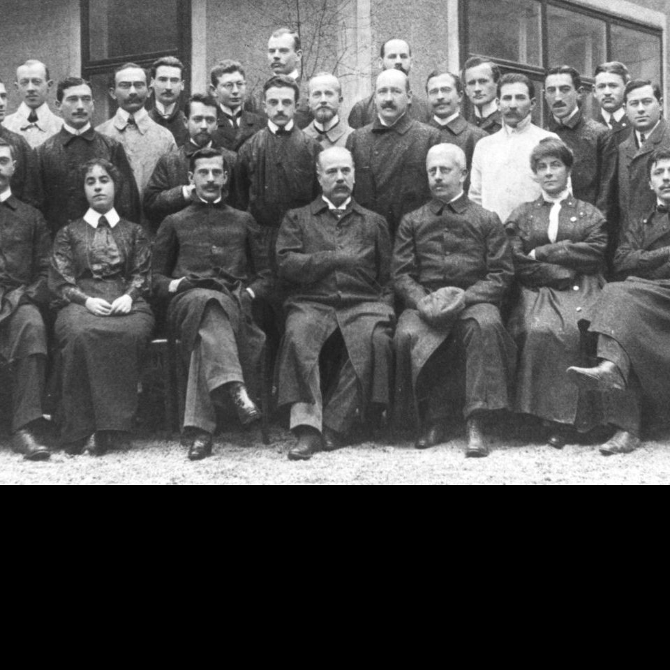 Anton Weichselbaum (1845–1920) mit seinen Mitarbeitern am Pathologisch-anatomischen Institut unter den Mitarbeitern unter anderen Karl Landsteiner (1. von links sitzend) Bildgattung Fotografie