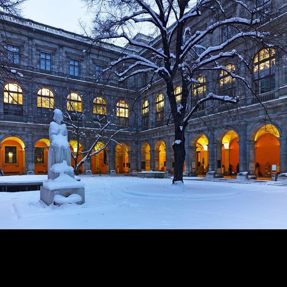 Arkadenhof der Universität Wien im Winter Quelle https://www.facebook.com/univienna/photos/pb.100078972227725.-220752000… Bildgattung Fotografie
