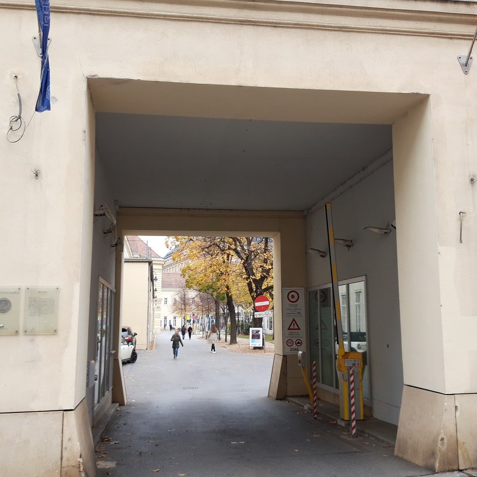 Beth-Tor der Erinnerung am Campus (ehemals AKH) zwischen Hof 1 und Spitalgasse, Blick von Hof 1 hinaus, Zustand 2019 Bildgattung Fotografie