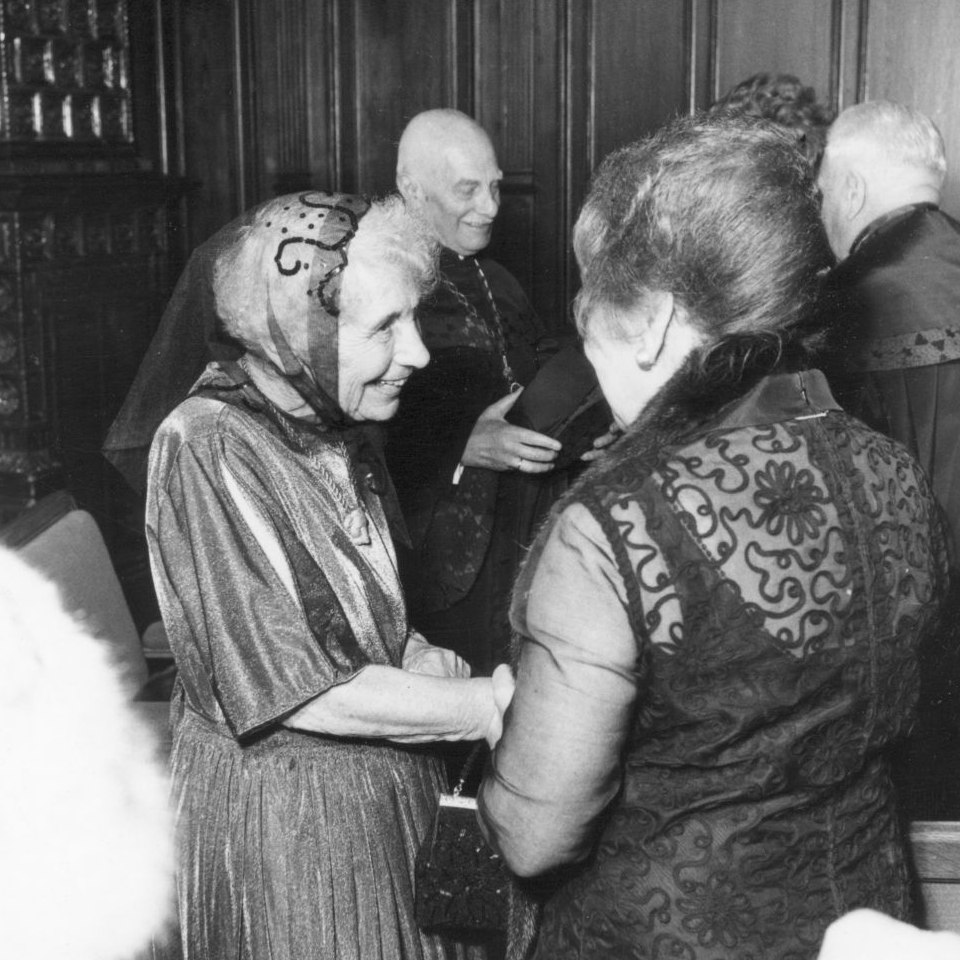 Bundesministerin Hertha Firnberg gratuliert Anna Freud zum Ehrendoktorat der Medizinischen Fakultät der Universität Wien Bildgattung Fotografie