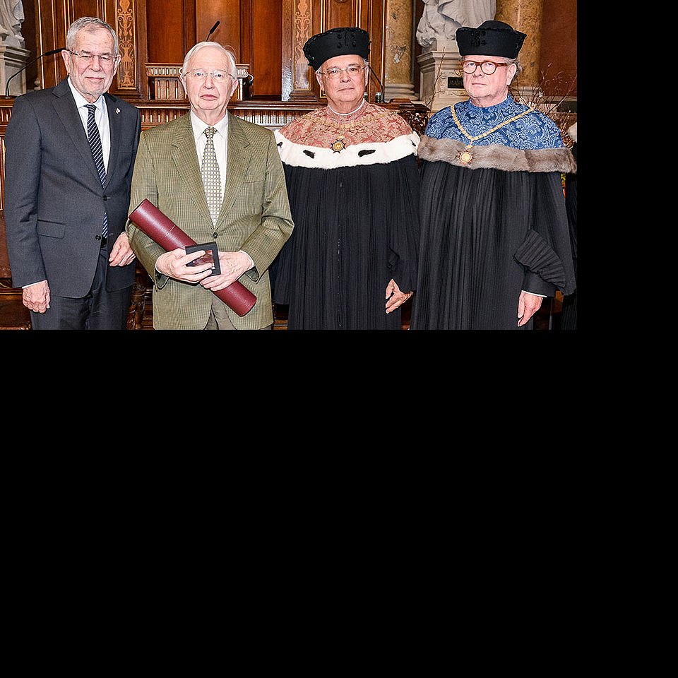 Bundespräsident Alexander van der Bellen, Nobelpreisträger Jean-Marie Lehn, Rektor Heinz Engl und Dekan Bernhard Keppler bei der Verleihung des Ehrendoktorats am Dies academicus der Universität Wien 2019