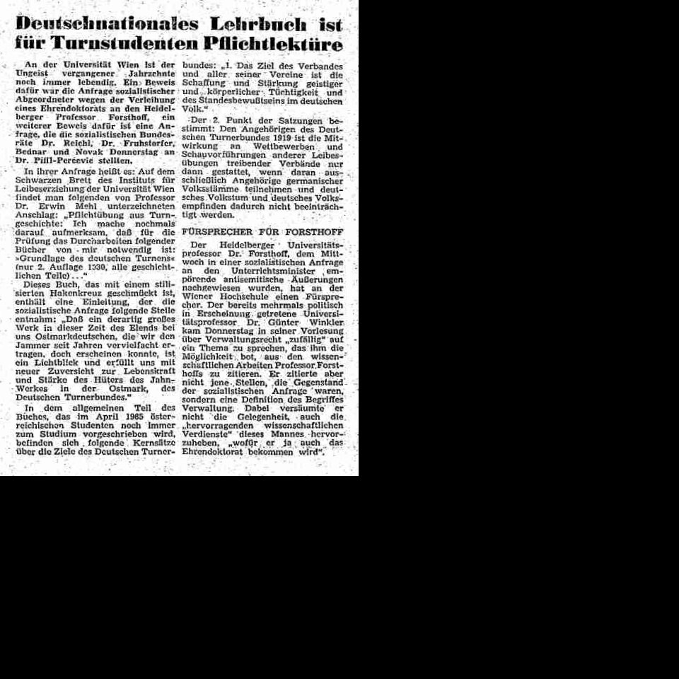 „Deutschnationales Lehrbuch ist für Turnstudenten Pflichtlektüre“, Zeitungsartikel in „Arbeiter-Zeitung“ vom 30. April 1965 Quelle https://www.arbeiterzeitung.info/ [Arbeiter-Zeitung vom 30. April 1965, S. 7] Bildgattung Dokument