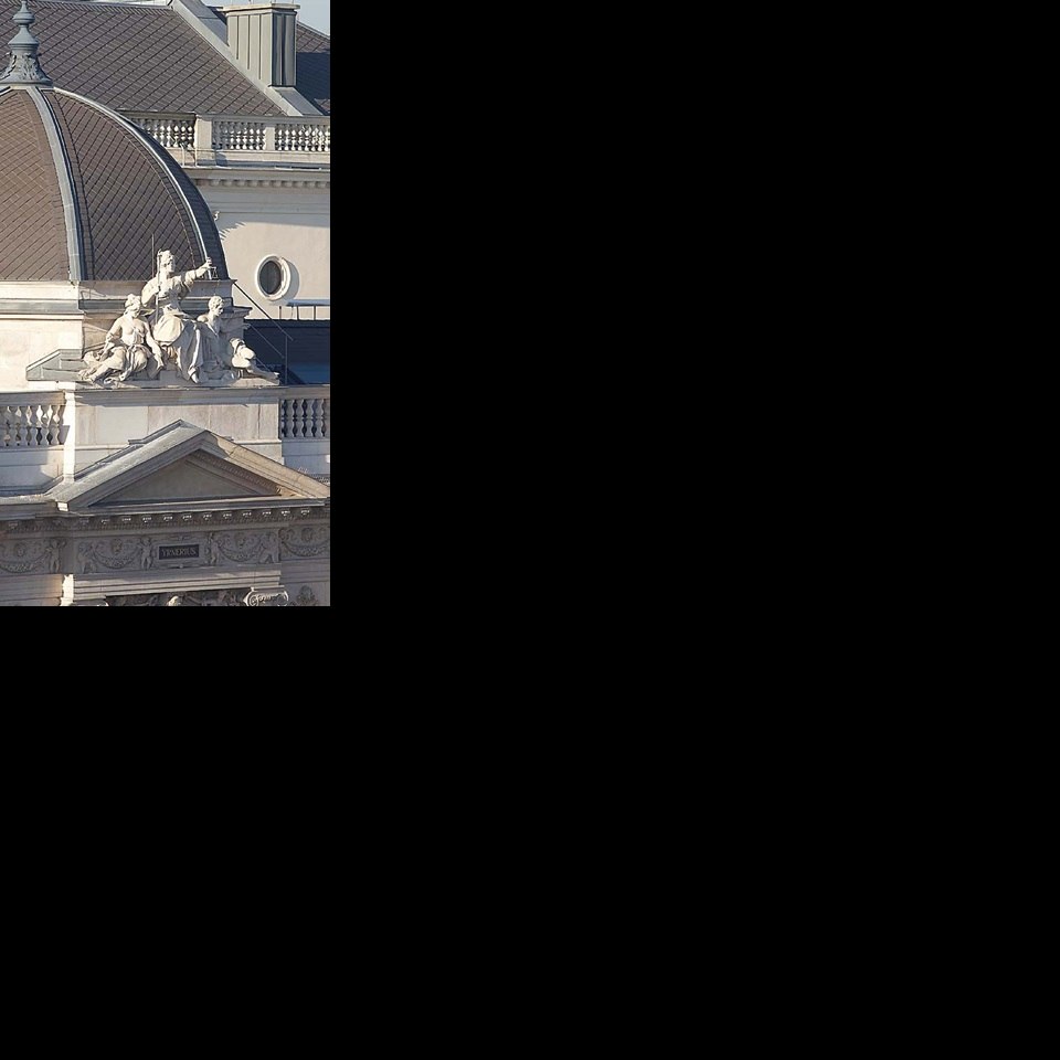 Die allegorische Gruppe der Jurisprudenz von Rudolf Weyr (um 1884) am Hauptgebäude der Universität Wien.