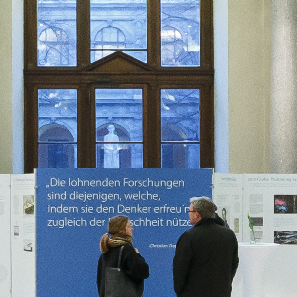 Die Ausstellung „Innovation durch Grundlagenforschung“ in der Aula des Hauptgebäudes der Universität Wien