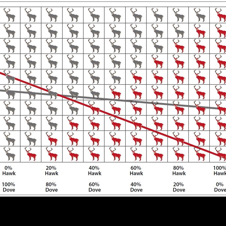 In einer natürlichen Population einer Art (z. B. Hirsche) gebe es zwei Subtypen, der eine bestehend aus aggressiven, kampfbereiten Individuen, die hier die „Falken“ (rot dargestellt) genannt sind und der andere bestehend aus konfliktscheuen Individuen, die hier als „Tauben“ (grau dargestellt) bezeichnet werden. Der eine Typ („Falken“) ist bereit, den Konflikt bis zum Umfallen zu eskalieren. Der andere Typ („Tauben“) sucht das Weite, wenn der Gegner eskaliert. „Falken“ leiden mehr als „Tauben“, wenn sie auf „Falken“ stoßen. Je nach Häufigkeit ist die eine oder die andere Variante erfolgreicher, es stellt sich im Gleichgewicht ein Gemisch ein (der evolutionstabile Zustand).
