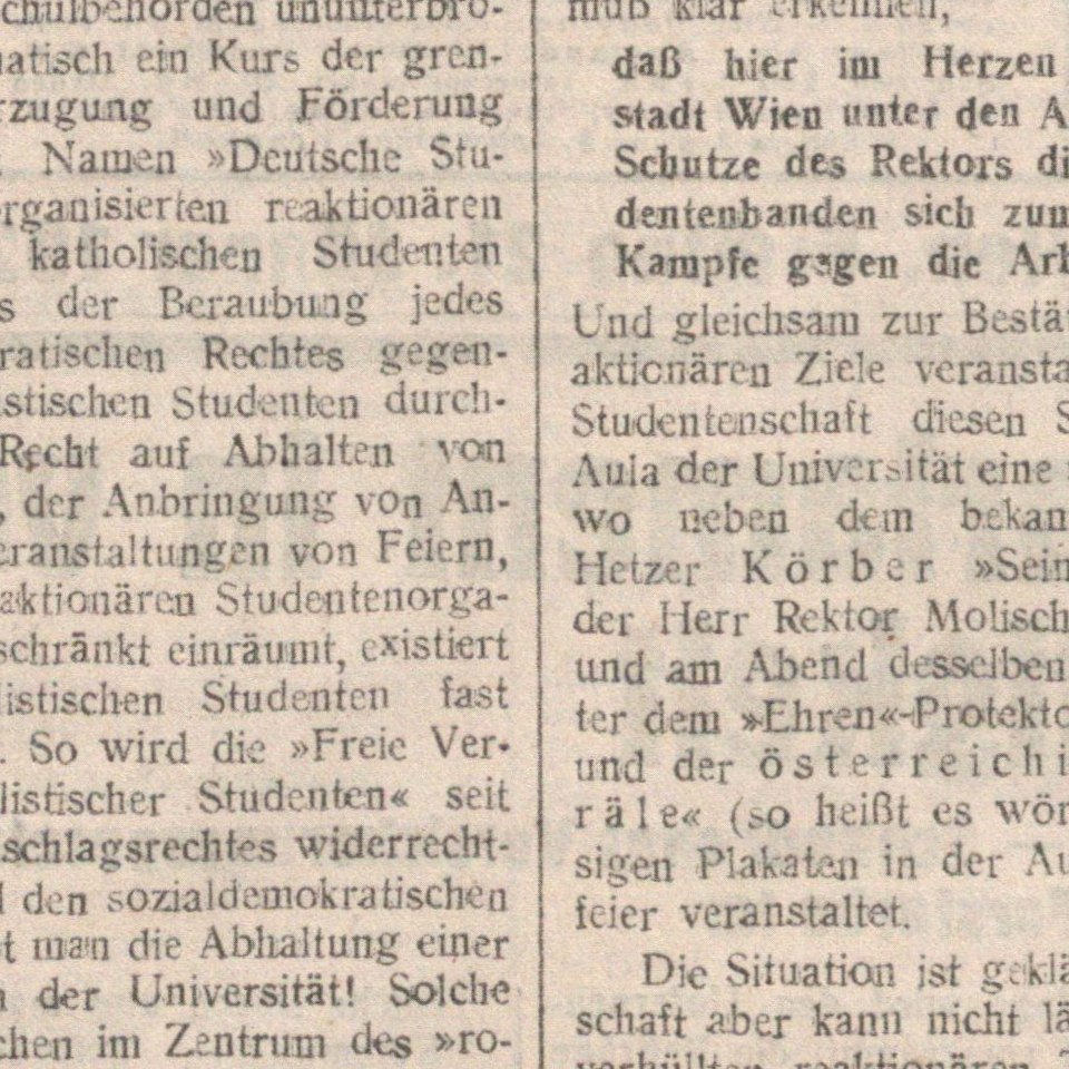 Und der Rektor der Universität, Molisch hat der Eröffnung, die letzte Woche veranstaltet wurde, beigewohnt, die Schießstätte im Namen des Universitälsamtes unter seinen Schutz gestellt, unter dem Beifall der zahlreichen Festgäste, so z. B. des Frontkämpferobersten Hilltl. Wer den Charakter, die Betätigung der »Deutschen Studentenschaft« kennt, ihre vom Haß gegen die Arbeiterbewegung erfüllten Pamphlete liest, die unter dem Zeichen des Hakenkreuzes auf der Universität in großer Zahl angeschlagen sind, muß klar erkennen,