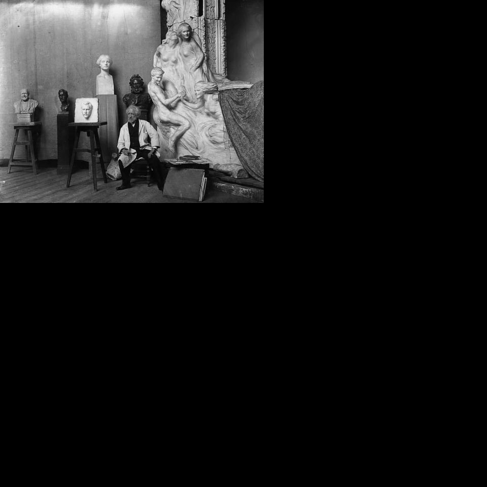 Edmund Hellmer (1850–1935) in seinem Atelier, 1923 – im Hintergrund der Kopf der Kastalia Bildgattung Fotografie