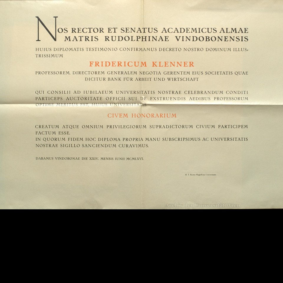 Ehrenbürger-Diplom Fritz Klenner 1966