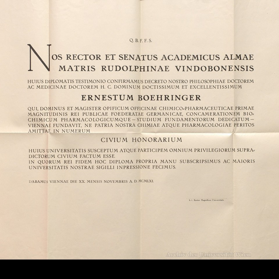 Ehrenbürgerdiplom Dr. Dr. h.c. Ernst Boehringer, 1962 Ehrenbürgerdiplom Dr. Dr.h.c. Ernst Böhringer, 1962 Bildgattung Dokument
