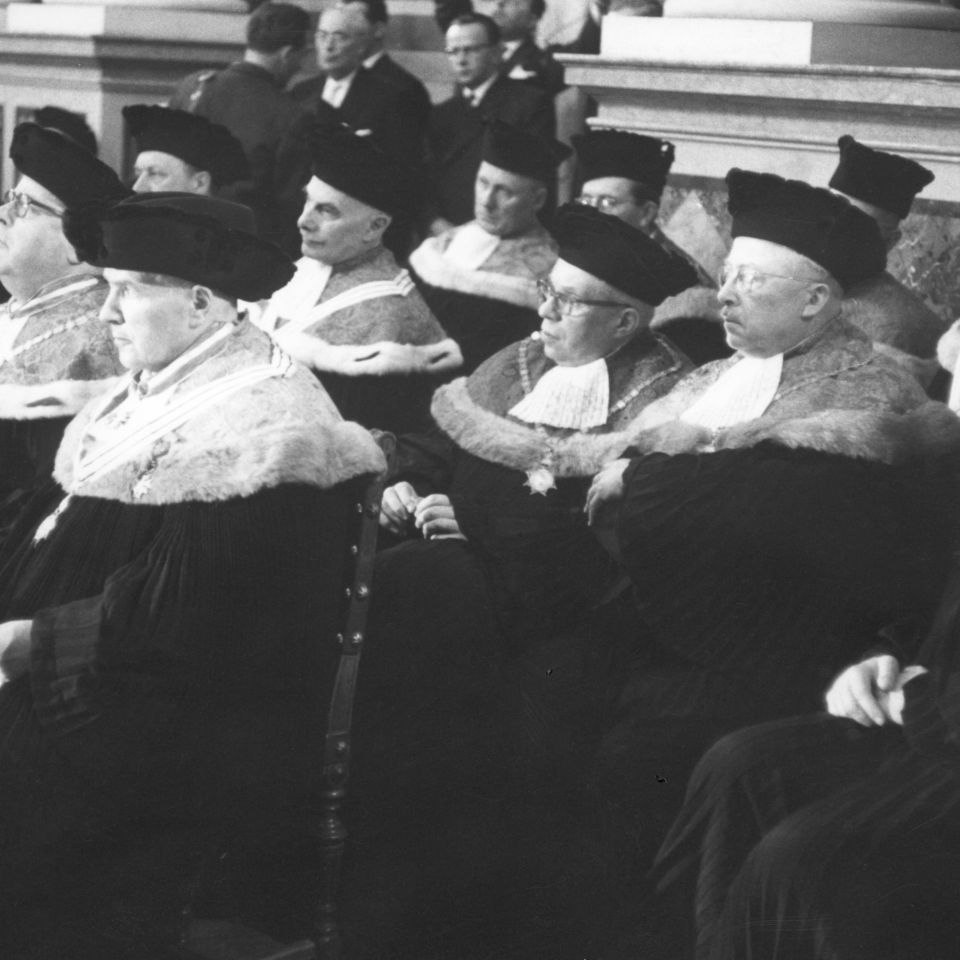 Ehrendoktoratsverleihung für Kardinal Eugene Tisserant: Würdenträger der Universität Wien, darunter Altrektoren mit dem Rektorserinnerungszeichen (am Band)