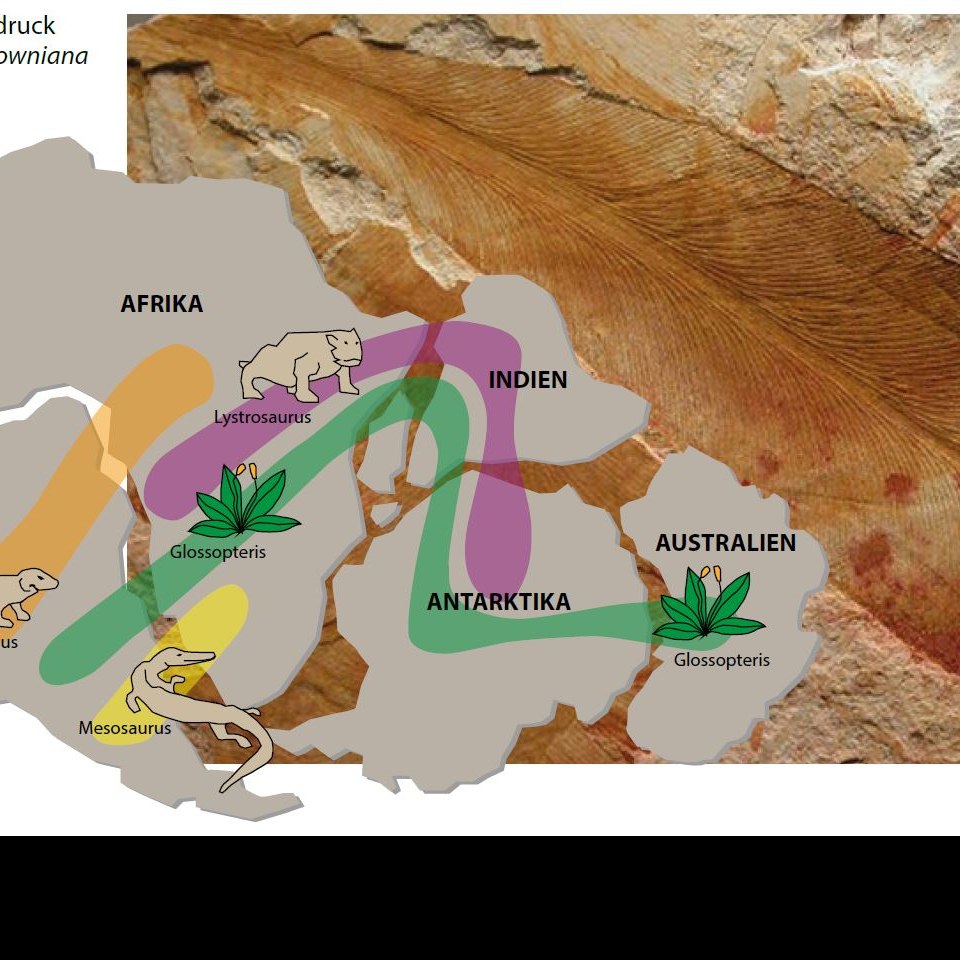 Die Gattung Glossopteris der ausgestorbenen Pflanzengruppe der Samenfarne gab der Pflanzenwelt des Gondwana-Kontinents zur Zeit des Perm ihren Namen. Fossile Blattabdrücke von Glossopteris-Arten finden sich im Gestein des gesamten Gondwana-Kontinents. Die Karte zeigt die paleobiogeographischen Verbreitungsgebiete von Glossopteris und dreier Vertreter säugetierähnlicher Reptilien.