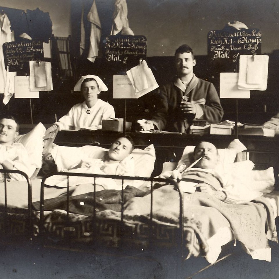Ein Hörsaal als Krankenzimmer für verwundete Soldaten, Hauptgebäude der Universität Wien, 1914 Bildgattung Fotografie