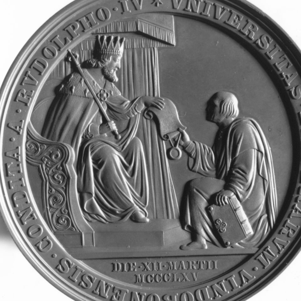 Bronzemedaille mit der Inschrift: UNIVERSITAS LITT:VINDOBON: RUDOLPHO IV:XII:MARTII MCCCLXV:SECULI V FRANC:IOS. I.
