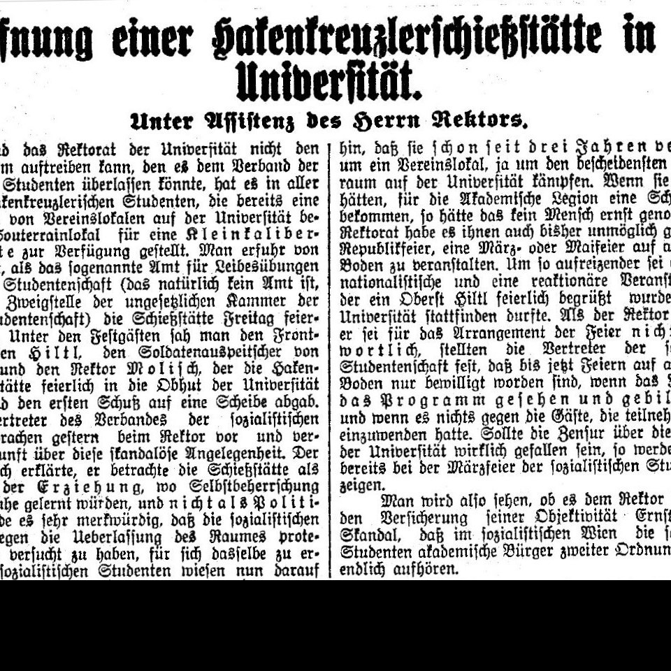 „Eröffnung einer Hakenkreuzlerschießstätte in der Universität Wien“, Zeitungsartikel in „Arbeiter-Zeitung“ vom 19. Jänner 1927