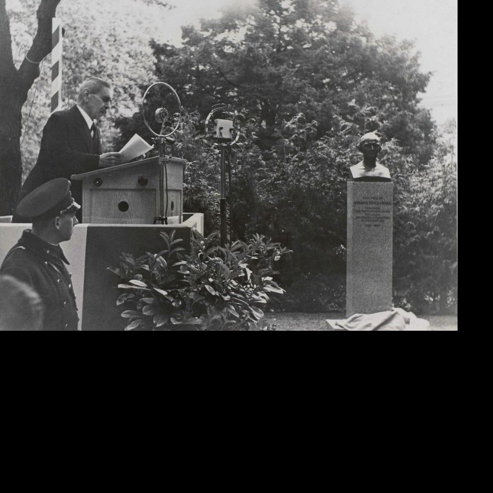 Eröffnung des Denkmals für Johann Peter Frank, Direktor des Allgemeinen Krankenhauses (AKH) von 1796-1804, im Hof 1 des AKH (heute Campus der Universität Wien) anlässlich der 150-Jahr-Feier des AKH, Festredner bei der Eröffnung am 18. Mai 1935 war Julius Wagner-Jauregg. Der Kopf wurde 1995 gestohlen, der leere Sockel befindet sich an leicht verändertem heute bis heute im Hof 1 das Campus der Universität Wien.