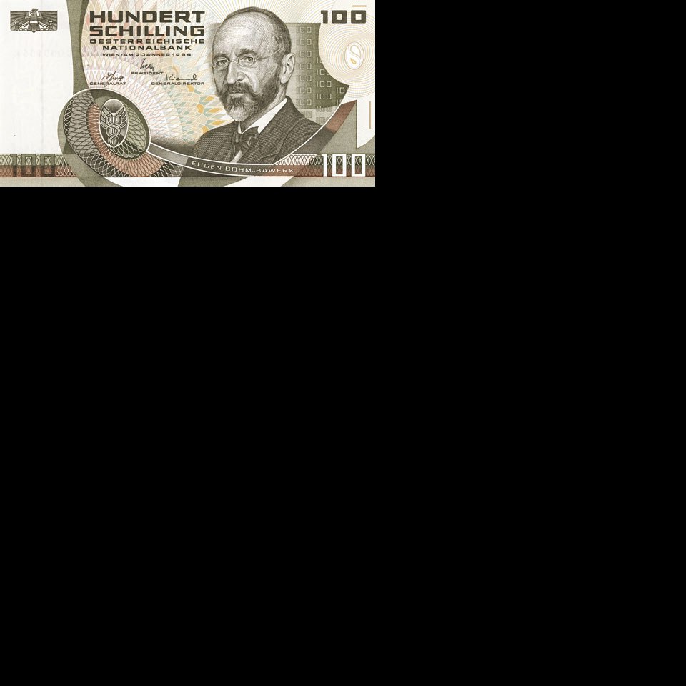 Eugen Böhm von Bawerk auf der Vorderseite der 100 Schilling-Note (1985)