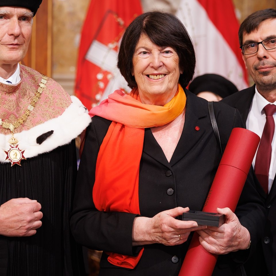 Eva Nowotny nach der Ernennung zur Ehrensenatorin am dies academicus 2025, zwischen Rektor Sebastian Schütze und Senatsvorsitzendem Stefan Krammer im Großen Festsaal der Universität Wien.