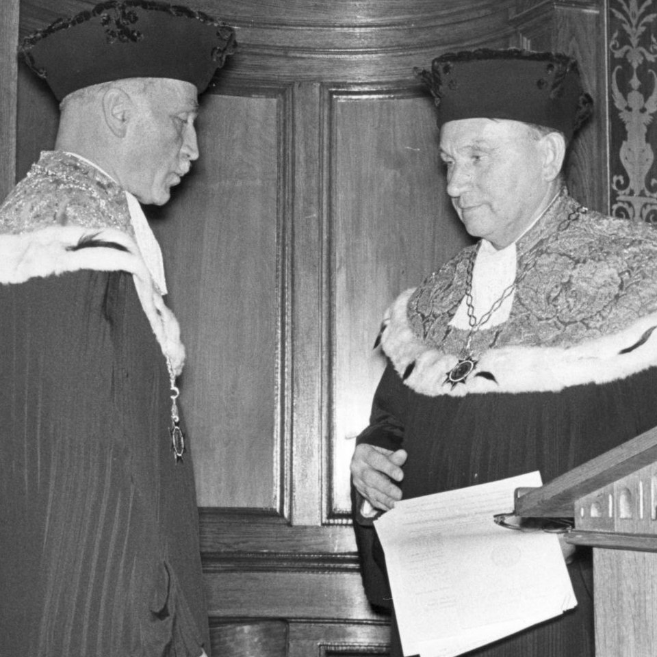 Feierliche Inauguration des Rektors Tassilo Antoine: Der neue Rektor Tassilo Antoine (mit der Rektorskette) und Prorektor Erwin Schneider (mit dem Rektorserinnerungszeichen)