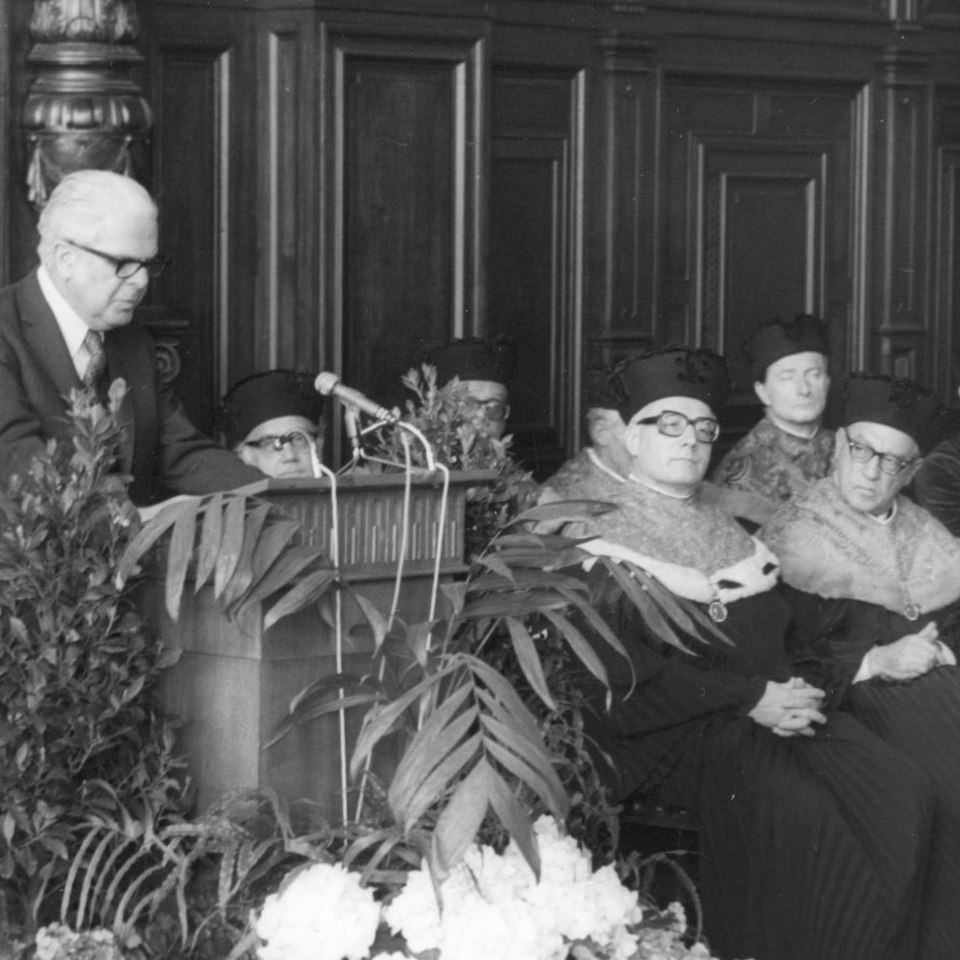 rechts neben dem Podium akademische Funktionäre, u.a. Rektor Franz Seitelberger und Dekan Otto Kraupp
