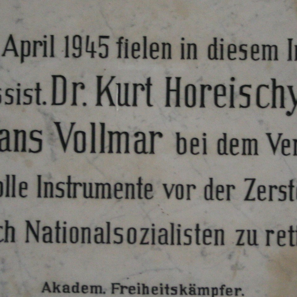 Gedenktafel zur Erinnerung an die Ermordung von Kurt Horeischy und Hans Vollmar durch Prof. Jörn Lange in den letzten Kriegstagen am 5.April 1945. Die vom Verband Akademischer Freiheitskämpfer gestiftete Tafel wurde am 28. Oktober 1947 im I. Chemischen Institut (heute: Fakultät für Chemie) in Wien 9., Währingerstr. 42 enthüllt und hing an der Seitenwand zum Stiegenhaus (Foto zeigt Situation 2007).