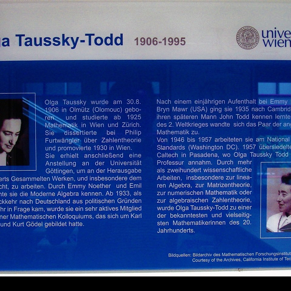 Gedenktafel im Olga Taussky Todd Saal im Institut für Mathematik im Universitätszentrum Althanstraße, die anläßlich der Benennung des Seminarraums nach der bedeutenden Mathematikerin am 18. April 2010 von Vizerektor Johann Jurenitsch und Dekan Harald Rindler enthüllt wurde.