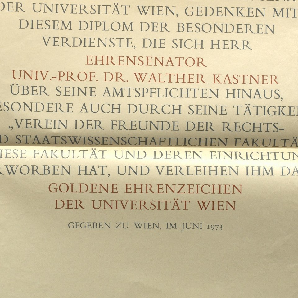 Goldenes Ehrenzeichen-Diplom Prof. Walther Kastner, 28. Juni 1973 Quelle UAW RA GZ 71/12 ex 1971/72 (= S 229.2.12)