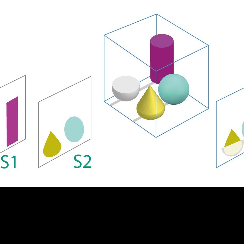 Grundprinzip der Tomographie: Sie ergibt überlagerungsfreie Schnittbilder S1 und S2, im Gegensatz zum Projektionsbild P der konventionellen Röntgenuntersuchung.