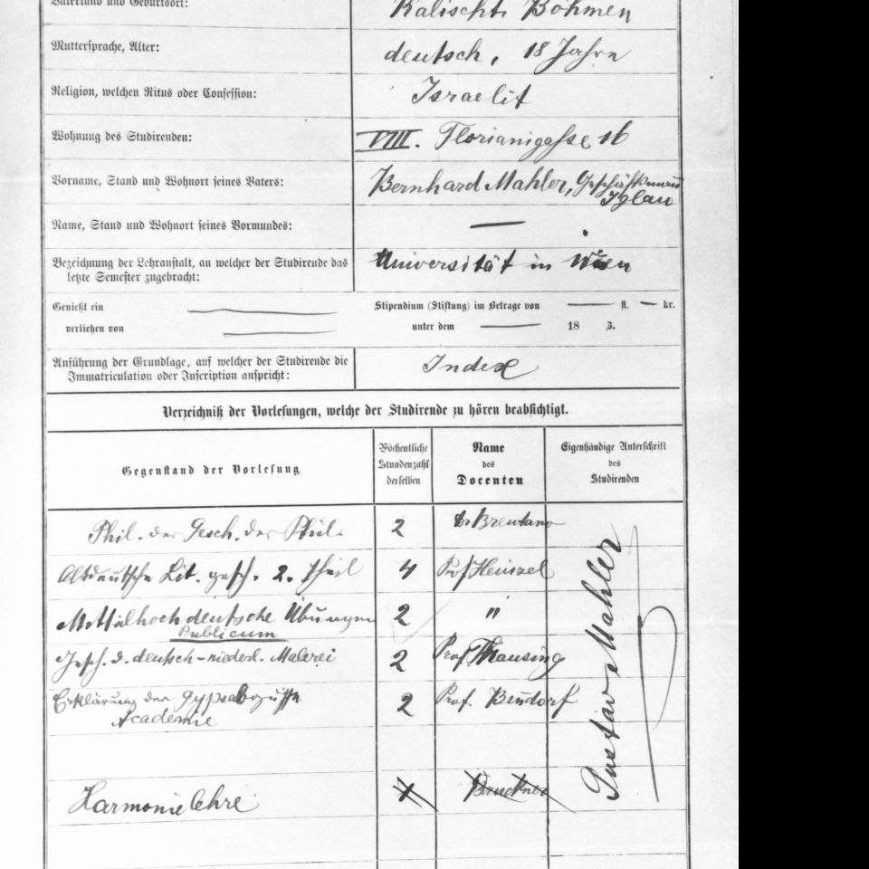 Gustav Mahlers eigenhändig geschriebenes Inskriptionsblatt der Universität Wien, Sommersemester 1878, für Anton Bruckners Vorlesung