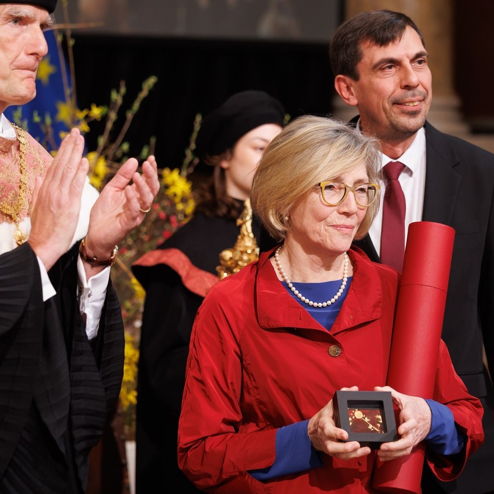 Ilse Schrittesser nach der Ernennung zur Ehrensenatorin am dies academicus 2025, zwischen Rektor Sebastian Schütze und Senatsvorsitzendem Stefan Krammer im Großen Festsaal der Universität Wien.