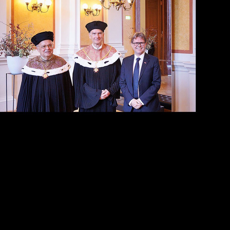 Inauguration des Rektors Sebastian Schütze: Der neue Rektor Sebastian Schütze (mit Rektorskette) und der scheidende Rektor Heinz Engl (mit Rektorserinnerungszeichen) mit Wissenschaftsminister Martin Polaschek