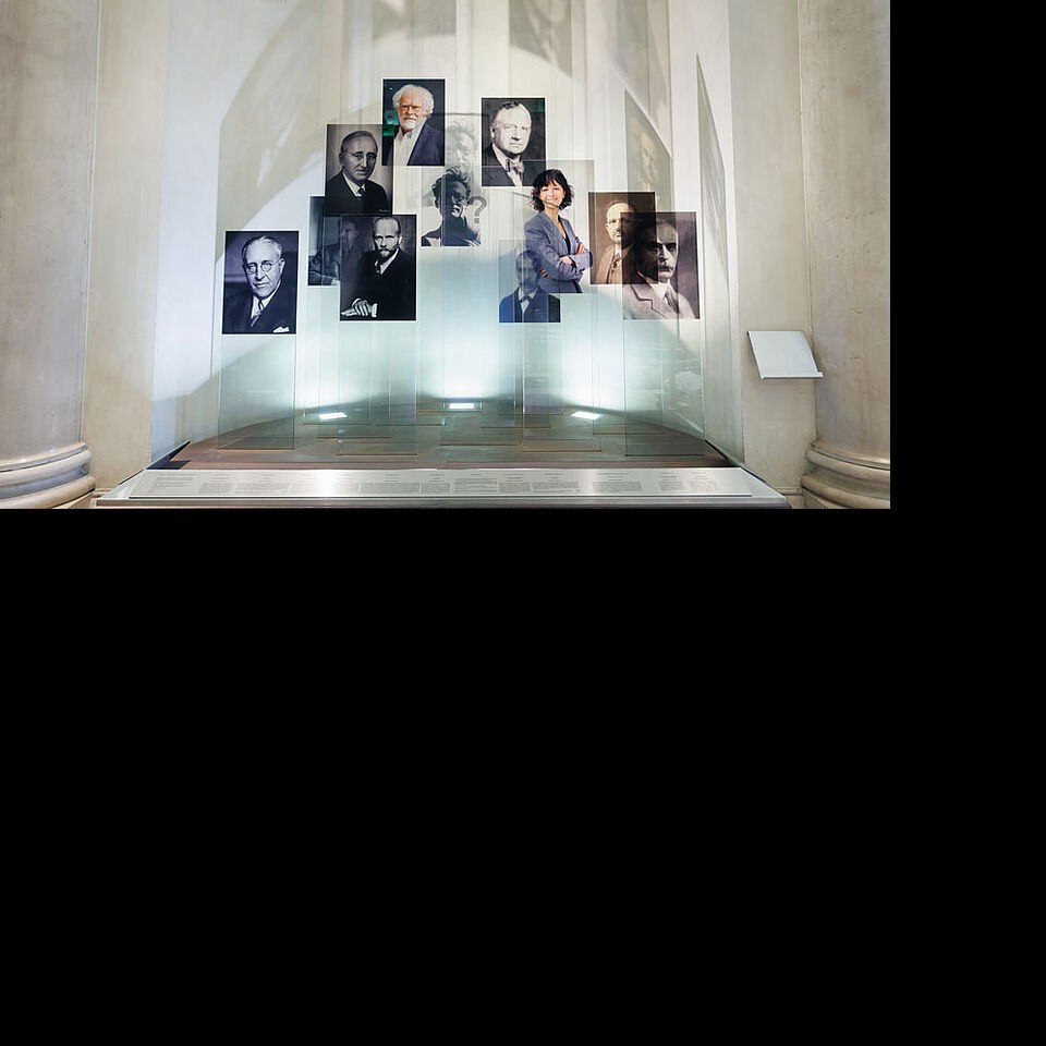Installation „Nobelpreis und Universität Wien – Gruppenbild mit Fragezeichen“ von Bele Marx & Gilles Mussard (2006/2025), Erweiterung 2025, eröffnet am dies academicus, 12. Märrz 2025, in Anwesenheit der Nobelpreisträger*innen Anton Zeilinger und Emanuelle Charpentier