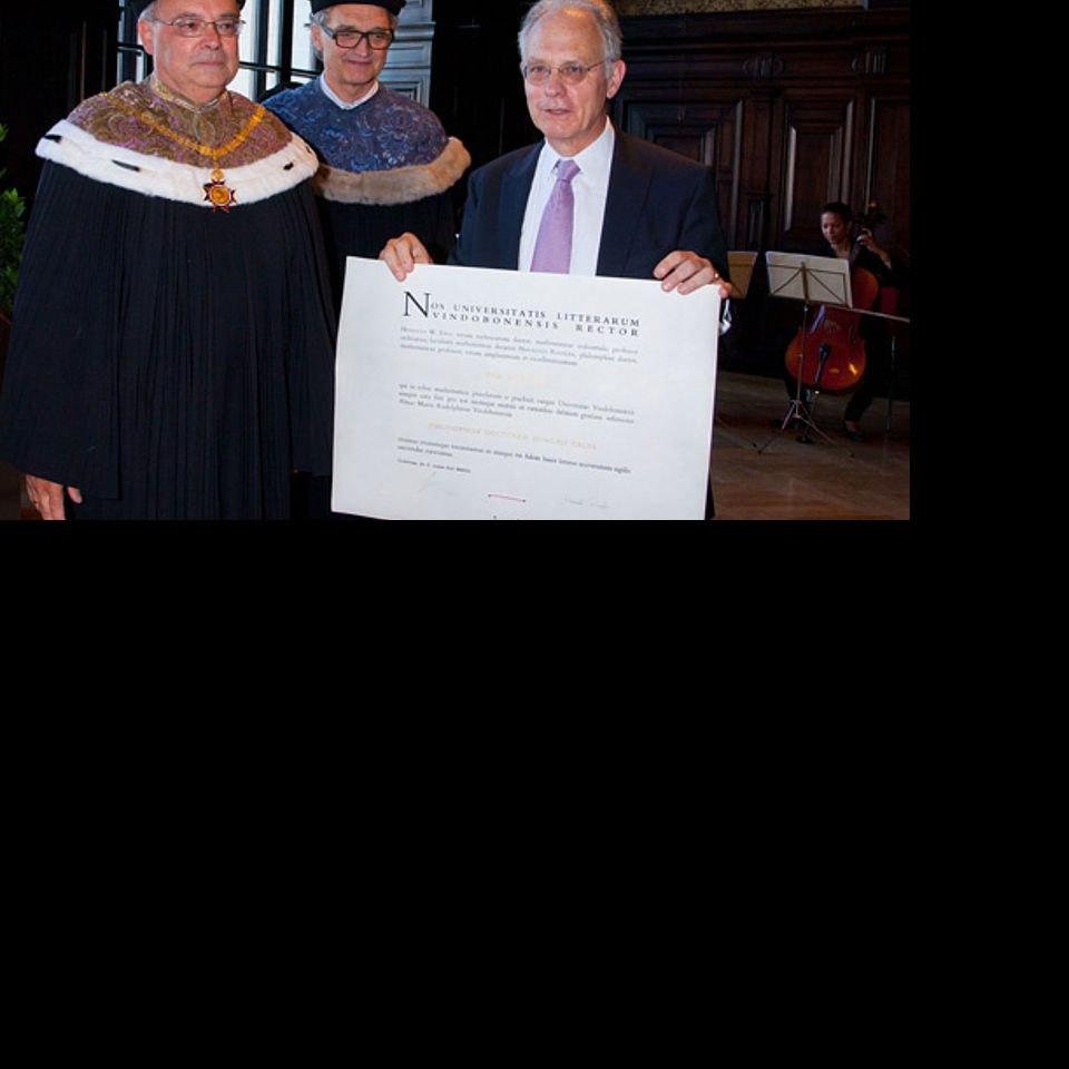 Ivar Ekeland bei der Verleihung des Ehrendoktorats der Universität Wien durch Rektor Heinz W. Engl und Laudator Walter Schachermayer vom Institut für Mathematik