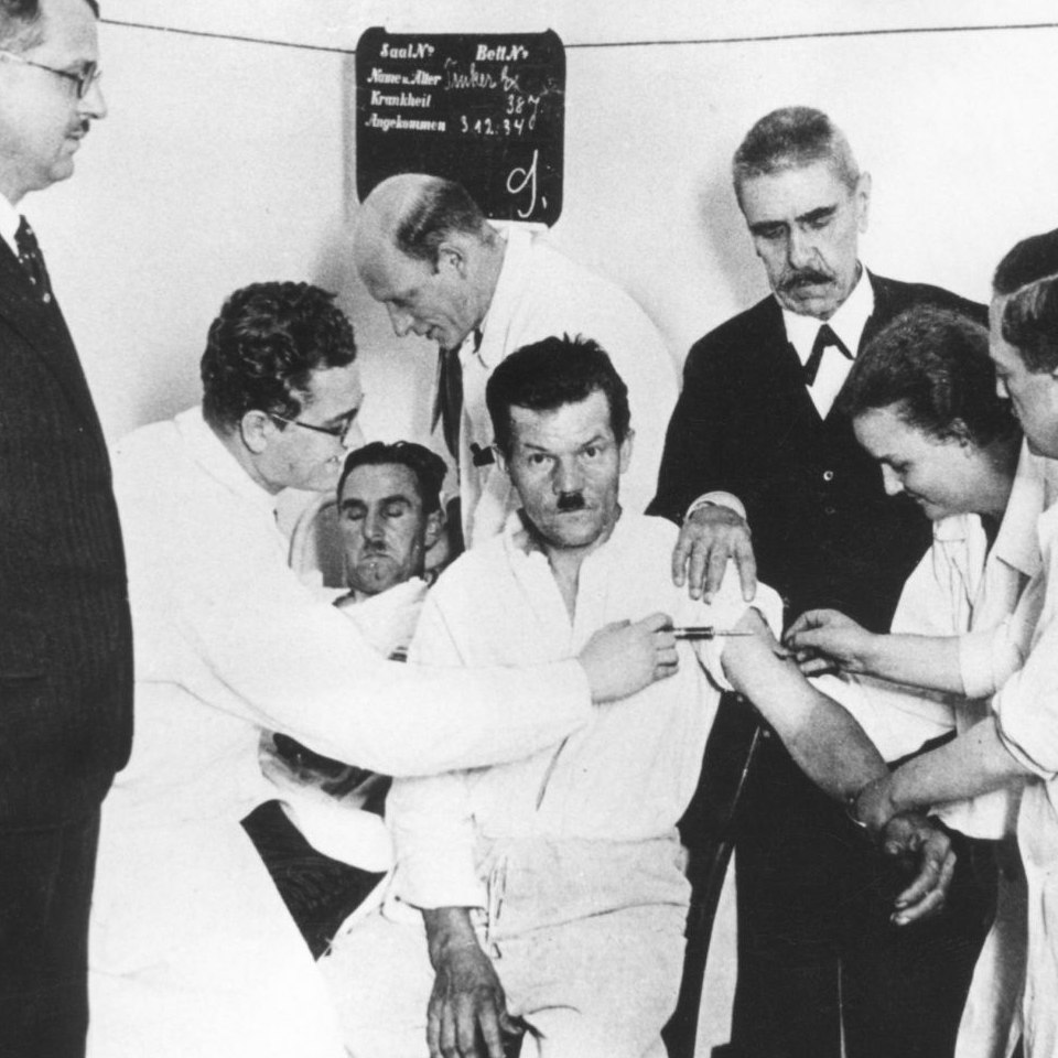 Julius von Wagner-Jauregg (1857–1940) mit Mitarbeitern an seiner Klinik bei einer Malariablutüberimpfung an einem Patienten Bildgattung Fotografie