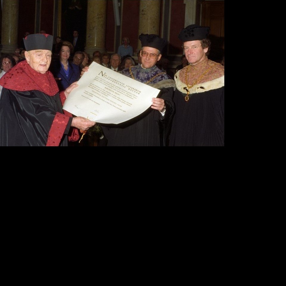 Marcel Prawy bei der Verleihung des Ehrendoktorats der Universität Wien durch Dekan Franz Römer und Rektor Ebenbauer Bildgattung Fotografie