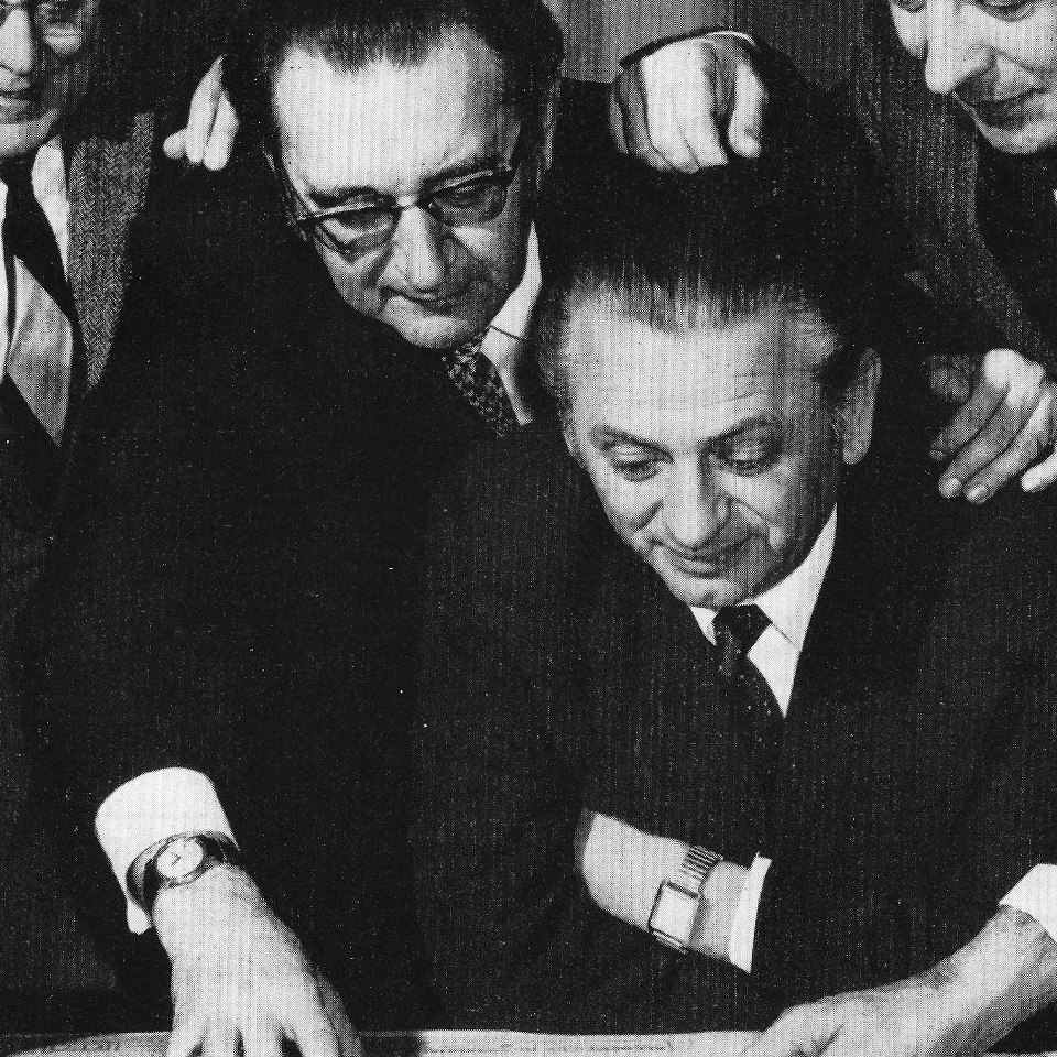 v.l.n.r.: Prof. Dr. Hans-Ulrich Riethmüller (Medizinische Beratung), Dipl.-Ing. Johann Vogel (Bauleitung/für die Republik Österreich), Dr. Franz Ritschl, Oberstadtbaurat Dipl.-Ing. Rudolf Foltin (Bauleitung/für die Stadt Wien), Oberamtsrat Hans Denk, Dir. Dr. Heinz Rode, Mag. Alexander Marchart (Architekt).